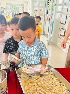 Mỗi buổi sáng tại Trường Mầm non Hoa Hồng 3, không khí luôn tràn ngập tiếng cười và mùi thơm của những món ăn ngon. Những đôi tay nhỏ bé khéo léo tự lấy bát, muỗng, rót sữa và lựa chọn món ăn yêu thích của mình. Các bé được khuyến khích tự phục vụ – một hoạt động tưởng chừng đơn giản nhưng mang ý nghĩa lớn trong việc rèn luyện tính tự lập, kỹ năng sống và sự tự tin cho trẻ.