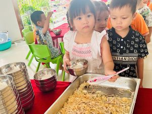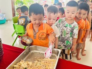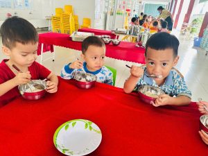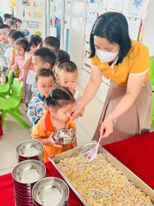 Bữa sáng không chỉ là thời gian nạp năng lượng cho một ngày học tập mới, mà còn là khoảnh khắc yêu thương khi các cô giáo nhẹ nhàng hướng dẫn, khích lệ từng bé biết tự chăm sóc bản thân. Trẻ vừa được ăn ngon, vừa học cách chia sẻ, hợp tác cùng bạn bè trong không khí vui tươi, thân thiện.